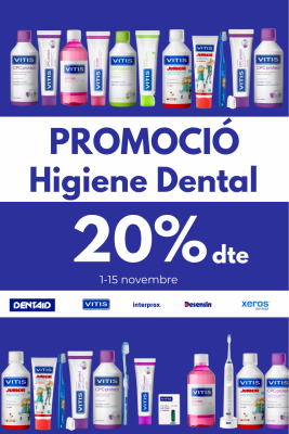 Durant la primera quinzena de novembre hi haurà un 20% de descompte en productes d'higiene dental desde la primera unitat en les marques DENTAID, VITIS, DESENSIN, XEROX i INTERPROX.
